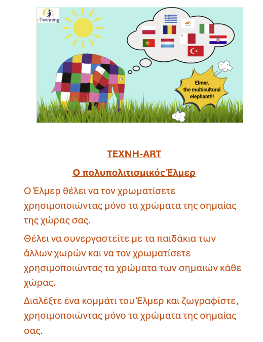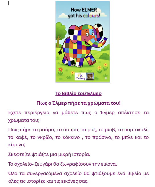 Τα σχολεία συνεργάτεσ έγιναν ζευγάρια. Το ένα σχολείο πρότεινε την ιστορία, πως πήρε ένα χρώμα ο Έλμερ και το άλλο την εικονογράφησε.